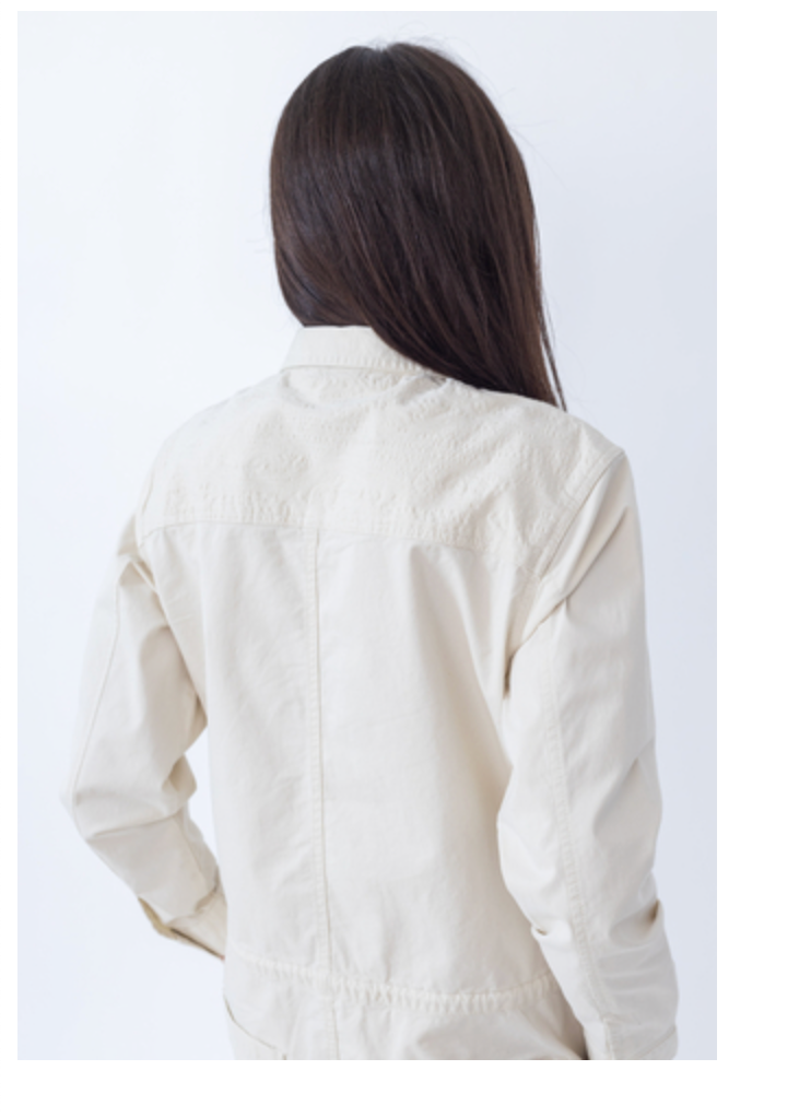 sleeves with button cuffs and wide straight legs. The decorative stitching
